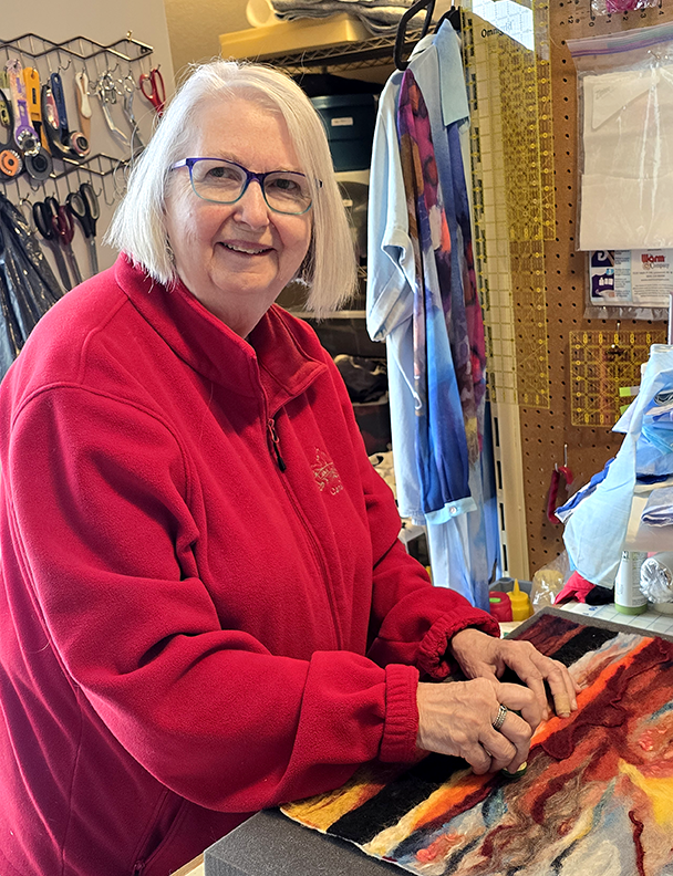 M. Anne Smith is a textile and fabric artist living in Guelph. She has always enjoyed art and, during her 31-year teaching career with the Upper Grand District School Board, took courses in painting, quilting, macrame and embroidery among other creative arts. By the time she retired, her focus had evolved into art quilting, needle felting, and mixed media. Over the years, Anne has taken inspiration from classes led by many talented artists, including Lorraine Roy, Helen Hughes, Marilyn Clark, Maggie Vanderweit and Elaine Quehl and from working with her fibre arts group. She augments this with her own photography and her extensive collection of books. Over the years, Anne has participated in the Hills of Erin Studio Tour, the Art Walk in Fergus and Art in the Street in Guelph. Her work has been exhibited throughout the county, including the former Burdette Gallery, Café Creperie, the Turn of Fate Studio, the Rockwood and Puslinch Libraries, the former Teak Barn Décor Store in Ospringe, the ECFTA and the Wellington Museum. “I love watching the beautiful sky colours as the sun rises and sets, particularly over the water. It is my happy place and always soothes my soul. In an extension of this feeling, creating my art, especially experimenting with colour and texture to create representations of sunsets, gives me the same sense of peace and escape.”