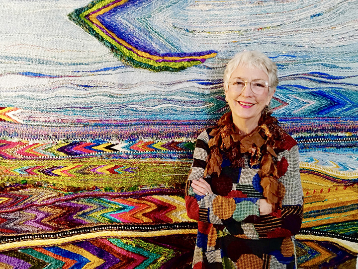 Diane Kennedy Cruttenden has been practicing the art of tapestry weaving and experimenting with fibre art since 1970. At that time Dianne moved from her home in Detroit, Michigan to attend the brand new Sheridan College School of Design in Lorne Park, Ontario, at the time a tiny campus of 150 like-minded ‘ hippies’ who threw themselves into creating pottery, blown glass, jewelry, furniture design, and printed and woven fibre art. Upon entering the weaving studio, for Dianne it was love at first sight. Since then, she has honed her skills, often carding, dyeing, and spinning her own yarn. While at Sheridan College she took a leave of absence to work with Robert Kidd, a renowned weaver in Michigan. Dianne’s work first appeared in a tapestry exhibition in 1972, held at the Detroit Institute of Art and has been exhibited and collected internationally since then.
