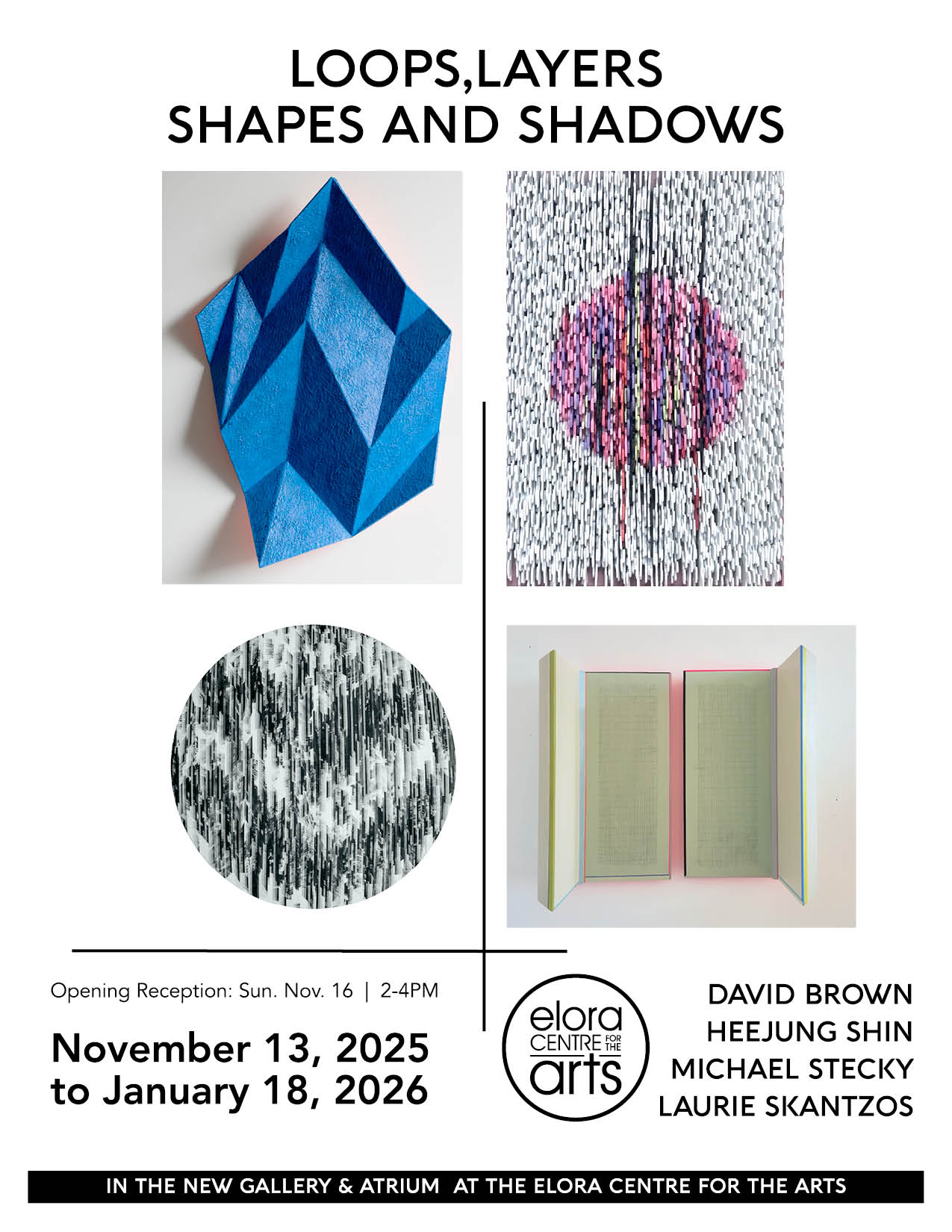 In Loops, Layers, Shapes and Shadows, four artists – David Brown, Heejung Shin, Laurie Skantzos, and Michael Stecky – gather at a point of creative departure. Each has stepped beyond the familiar territory of their established practice, venturing into spaces of experimentation and discovery. Together, they invite us to consider not only what is made, but how and why—and what happens when the act of making itself becomes a form of renewal.